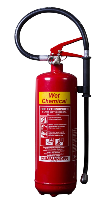 For Class F fires – fires involving cooking oil, fats and vegetable oils – a wet chemical extinguisher is used. These extinguishers should be present in any commercial kitchen environment so you are able to tackle kitchen fires effectively. Wet chemical extinguishers also remove the heat element from a fire, but they also smother the fire by cutting off the oxygen from the fuel. This prevents the fire from reigniting, allowing you to manage and control the fire before it spreads. Wet chemical fire extinguishers can also be effective against Class A fires, and are identified with a yellow label.